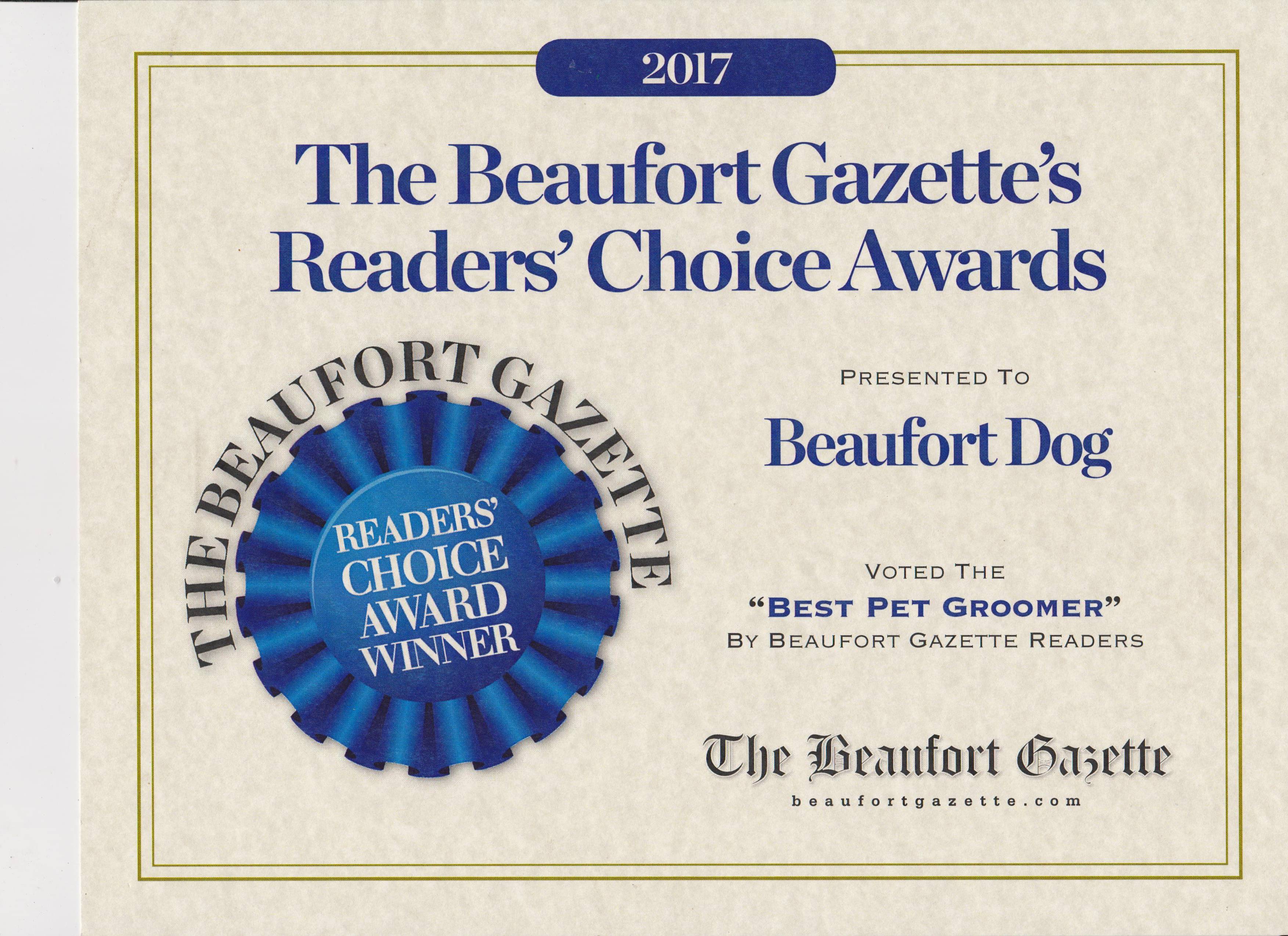 We just received our certificate from The Beaufort Gazette for the Readers’ Choice Award for Best Pet Groomer for 2017. We appreciate all of you for making this possible! Call us at 843-812-5394 to set up an appointment for your dog.
