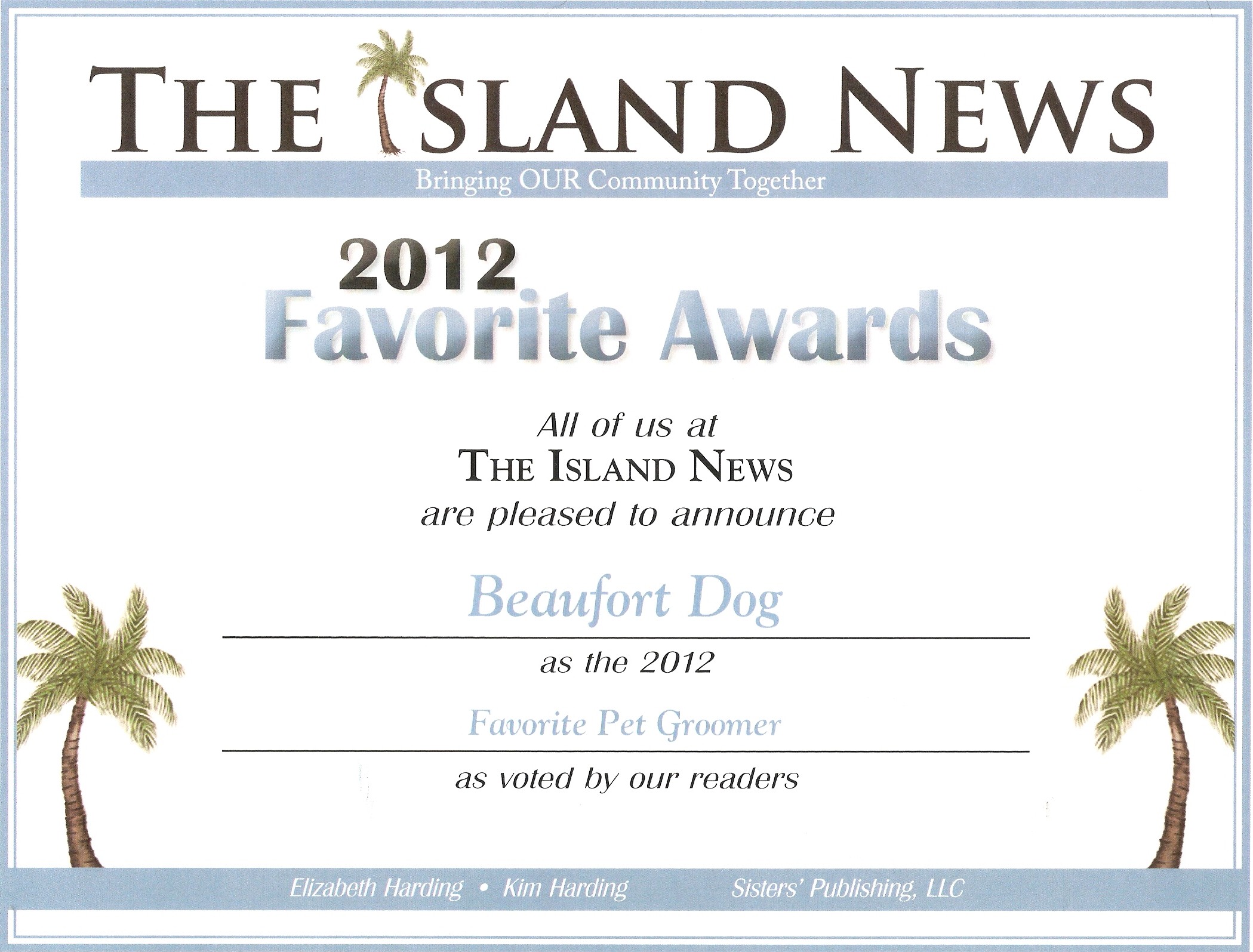 Grooming Registration Almost Complete Posted January 1, 2013 in News 2224 Views Voted The Island News Favorite Groomer 2010, 2011, 2012, 2013 Thank you. We look forward to providing you with Beaufort’s best dog grooming! Please take a moment to confirm some basic information below. Email First Name Last Name