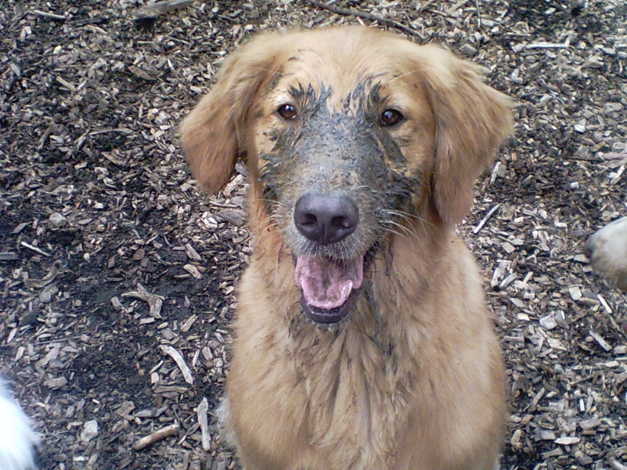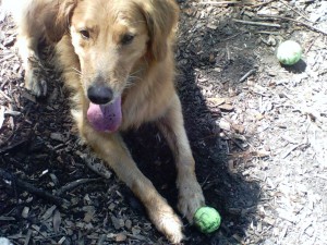 This is Sammie. He is a big golden boy who loves to come and play with us! He is one of the first dogs that ever came to Beaufort Dog and has been coming to play ever since. His favorite game is fetching a tennis ball and he gets our attention to play with him by digging holes (as you can see in this picture) to put the ball in. He will play and play until he just can’t play any more. If he’s not playing ball then he is in the pool or digging in our water buckets and then rolling in the dirt to get nice and dirty! He is one of our great buddies!